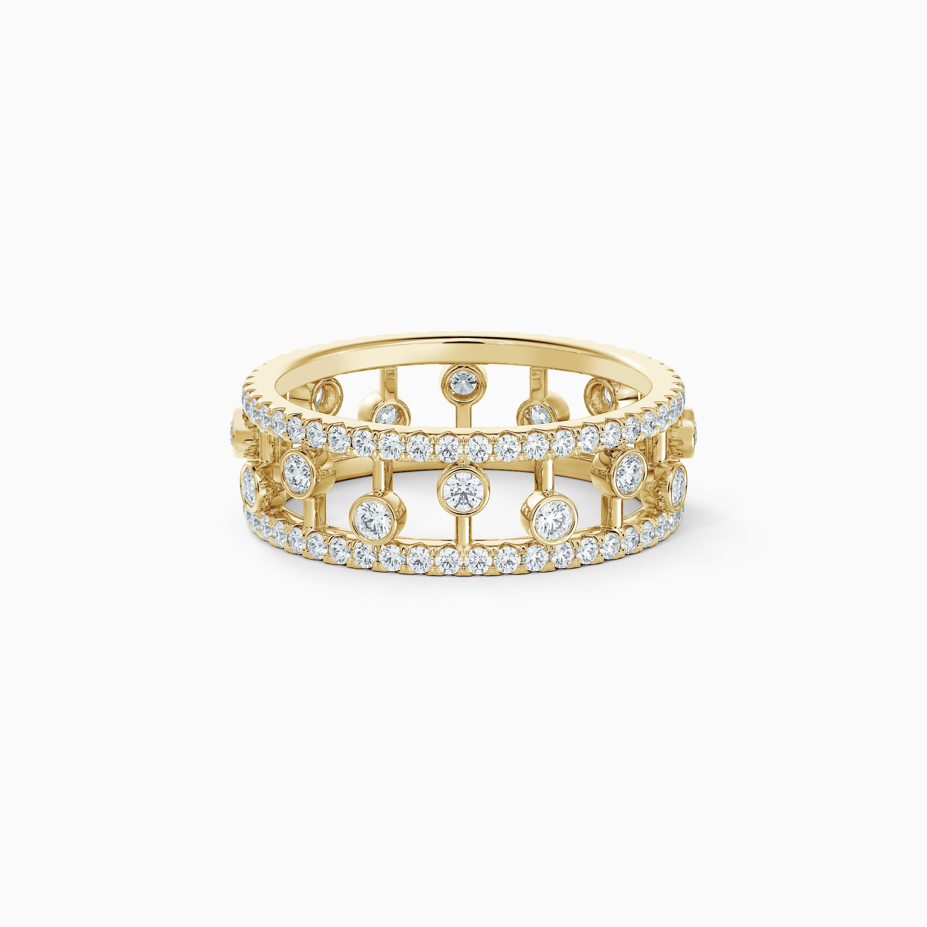 This elegant 18K yellow gold and diamond ring is inspired by the water palace that Roman Emperor Hadrian is said to have constructed in tribute to his lover. Two delicate bands form its outer frame at a width of 6.0 mm, each set with a row of diminutive micropavé diamonds. Between these, larger bezel-set round brilliant diamonds are suspended on columns, recalling droplets of dew. The yellow gold lends this piece a warmth, while the diamonds set within it reflect and refract the light for maximum Brilliance. Each of these diamonds has been ethically sourced in accordance with the Kimberley Process. Their combined weight totals ~0.89 carats.