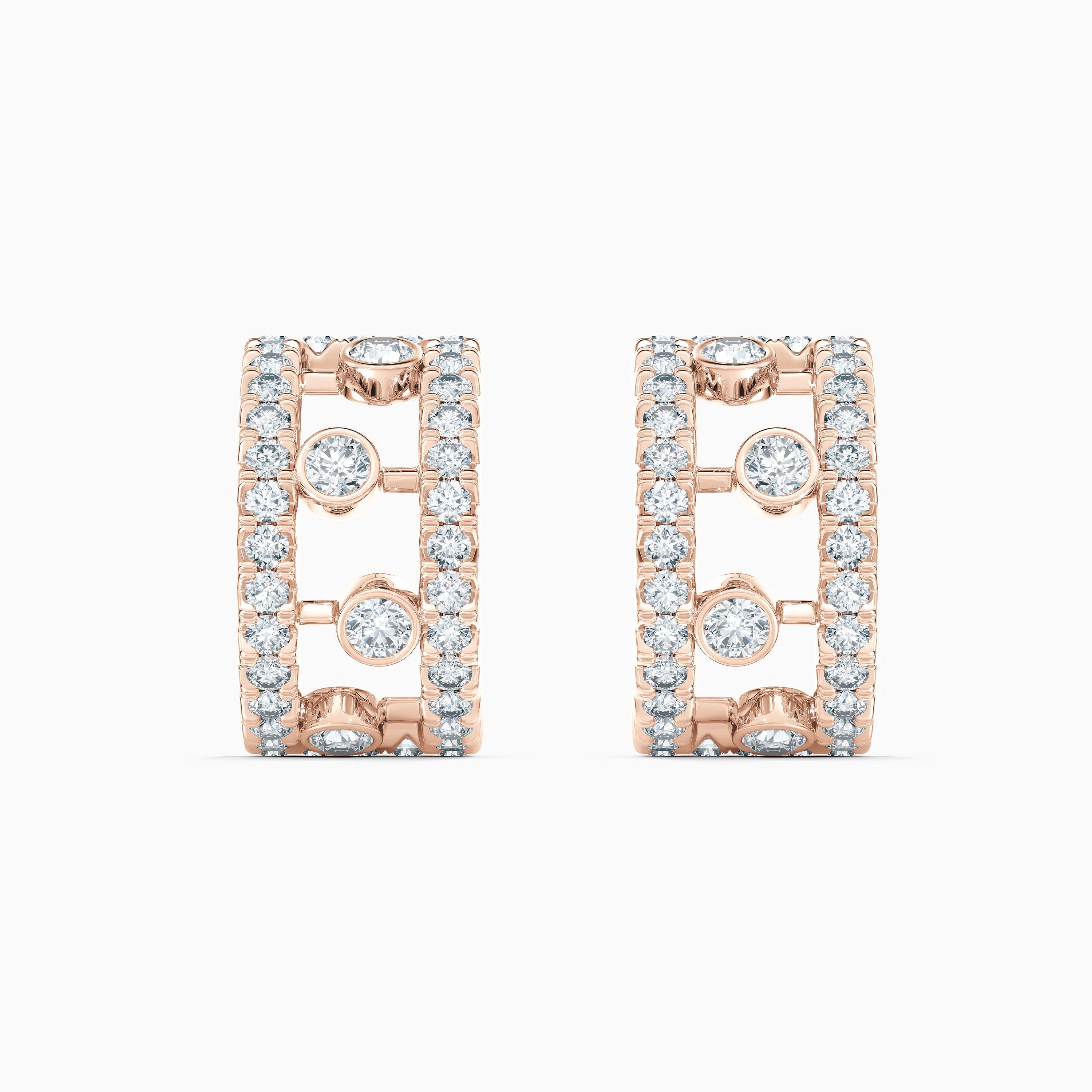 Two delicate lines of meticulously set round brilliant diamonds form the frame of these elegant 18K rose gold earrings. Connecting them, larger bezel-set diamonds sit suspended on individual columns of rose gold, like dewdrops caught on the petals of flowers at sunrise. This modern arrangement forms a refined hoop earring, generously catching the light. Each of the 80 diamonds in this piece is ethically sourced and selected by eye for its individual Fire, Life and Brilliance. Their combined weight is ~0.68 carats.