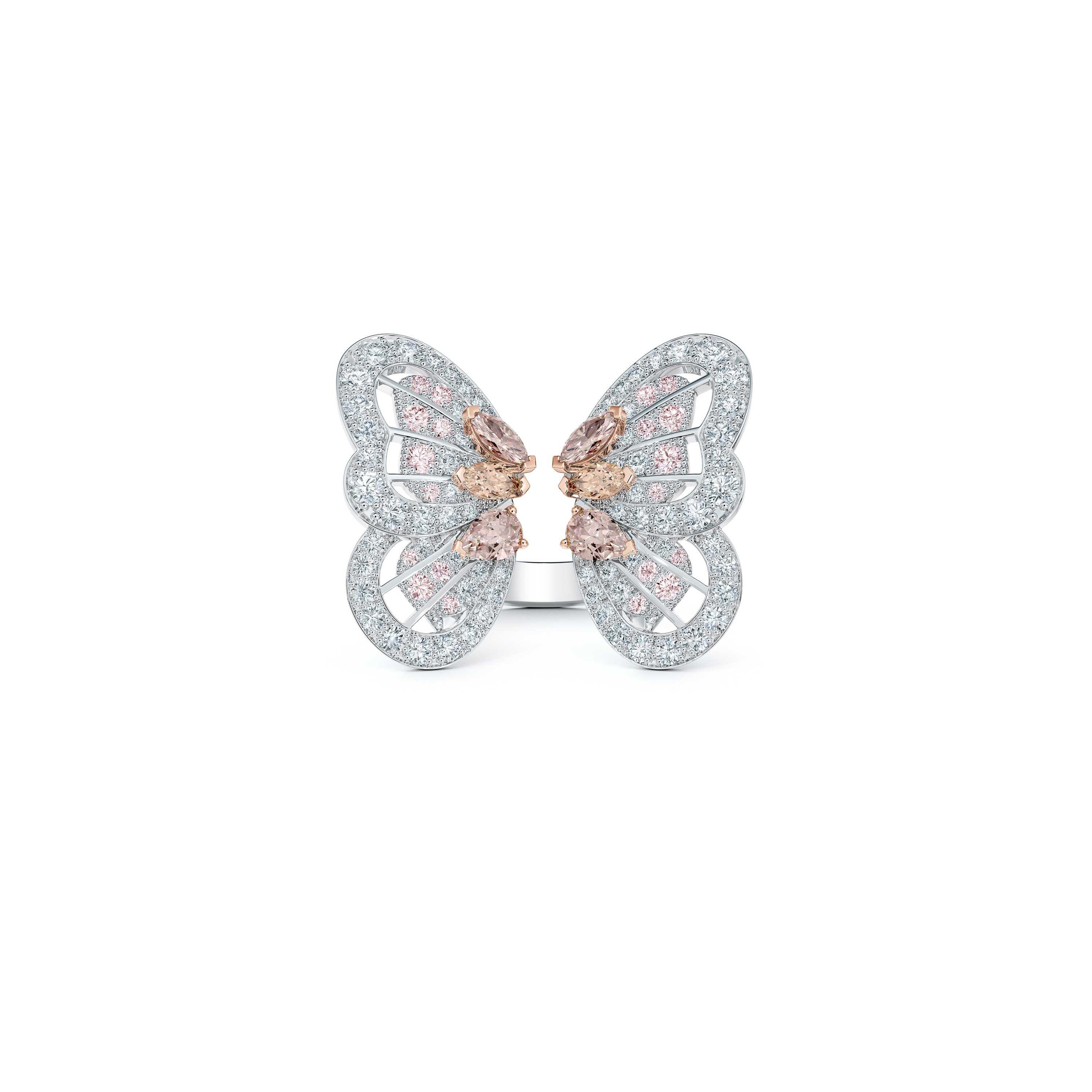 Ode à la symbolique de transformation du papillon, cette bague cocktail arbore d’exceptionnels diamants bruns rosés de différentes formes qui soulignent l’iridiscence des ailes de papillon, dont le poids total est d'environ 2,77 carats. Riche en détails, cette bague arbore un design délicatement ajouré qui permet à la lumière naturelle de se diffuser à travers les ailes pour créer un éclat exceptionnel sous tous les angles.