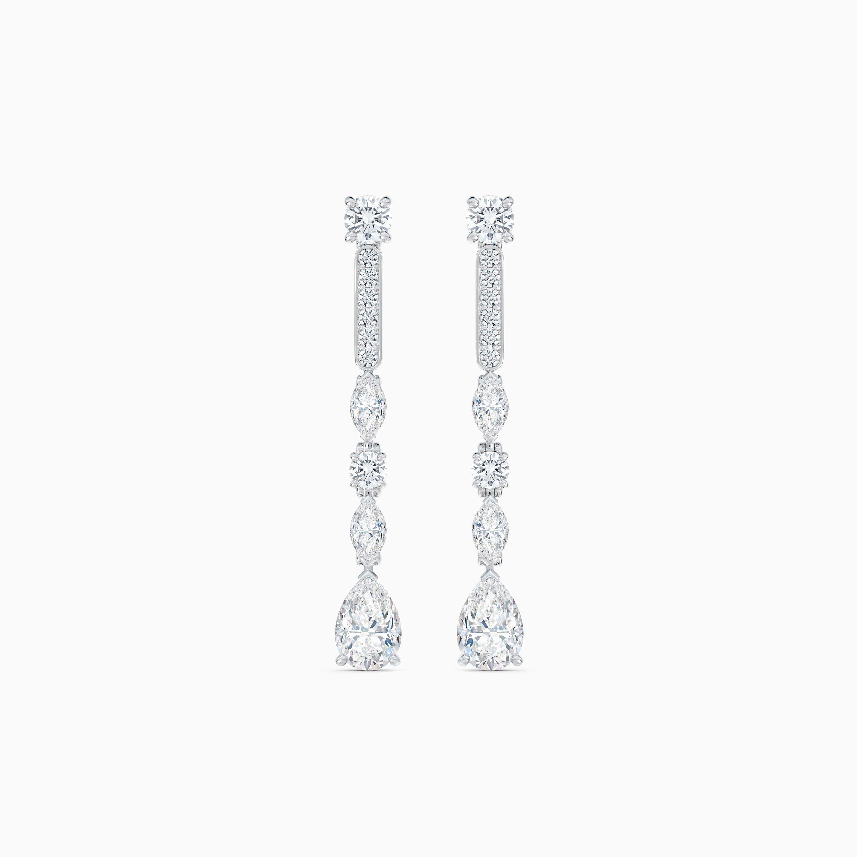 Ces boucles d'oreilles spectaculaires en or blanc 18 carats sont une réinterprétation sophistiquée et élégante de la ligne de diamants classique. D'un poids total d'environ 2,75 carats, les lignes de diamants blancs de tailles marquise et brillant sont sublimées par un diamant taille poire, suspendu à leur extrémité. Sélectionnés à la main pour leur pureté et leur brillance, les diamants ont été méticuleusement sertis pour capturer la lumière à chaque mouvement.