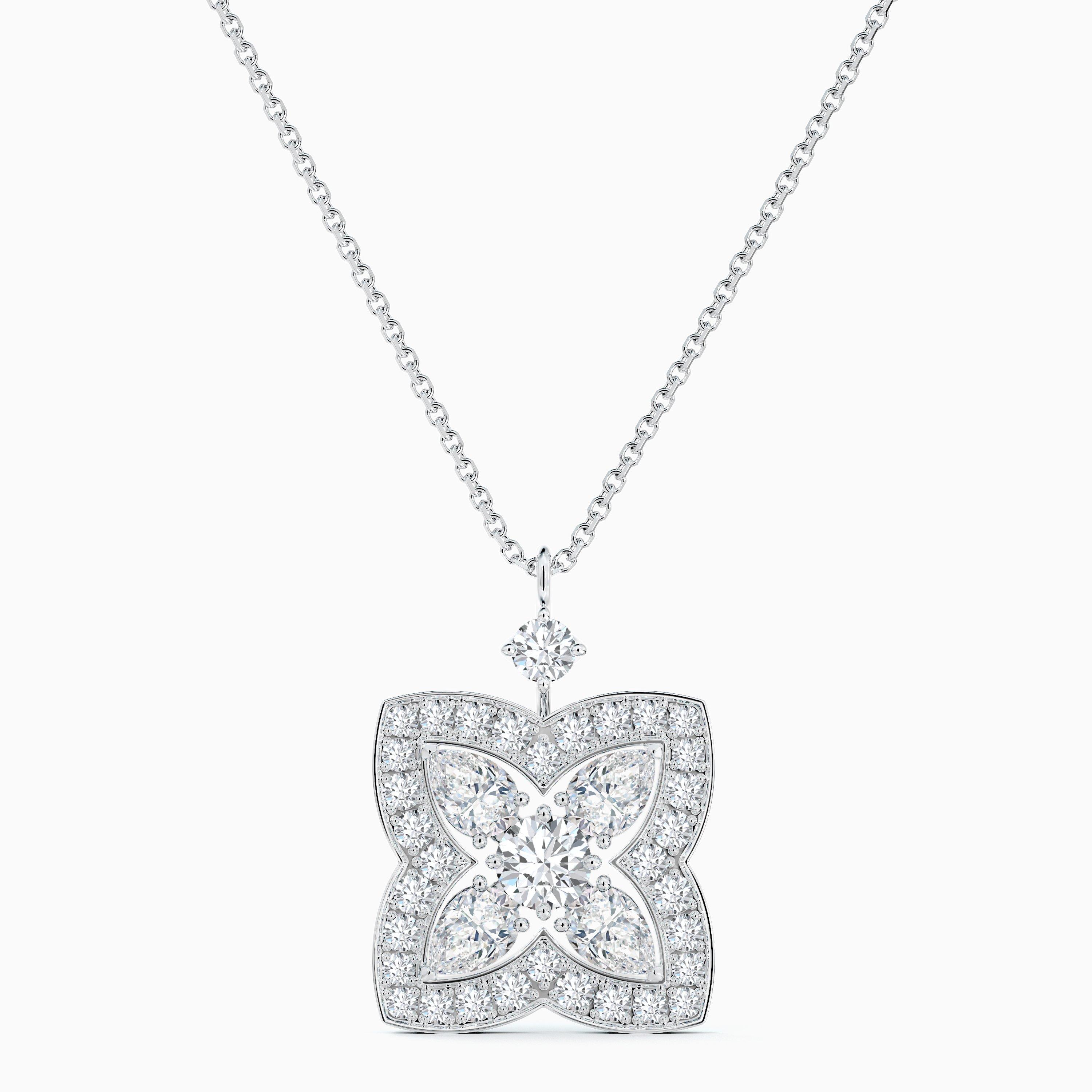 Élégant et discret, ce pendentif en diamant et en or blanc 18 carats s’inspire de la fleur de lotus, symbole de pureté et d’éternité. D’un poids total de 2,96 carats, le délicat pendentif est orné de diamants taille poire ainsi que de diamants micro-pavés taille brillant. Issus d’une filière éthique, les diamants sont sélectionnés à la main pour leur pureté et leur éclat par les experts De Beers.